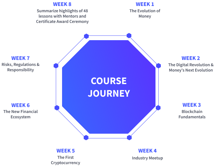 In just 8 weeks, you’ll explore blockchain and crypto step by step — from basic concepts to real-world applications — gaining the confidence to discuss the technology and earn your certificate along the way.